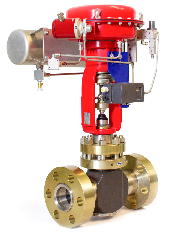 Регулирующе-отсечной клапан на высокое давление DN 100 мм с пневматическим приводом, позиционером, электромагнитным клапаном КСВ, сигнализатором конечных положений СКП, двумя фильтрами-регуляторами.