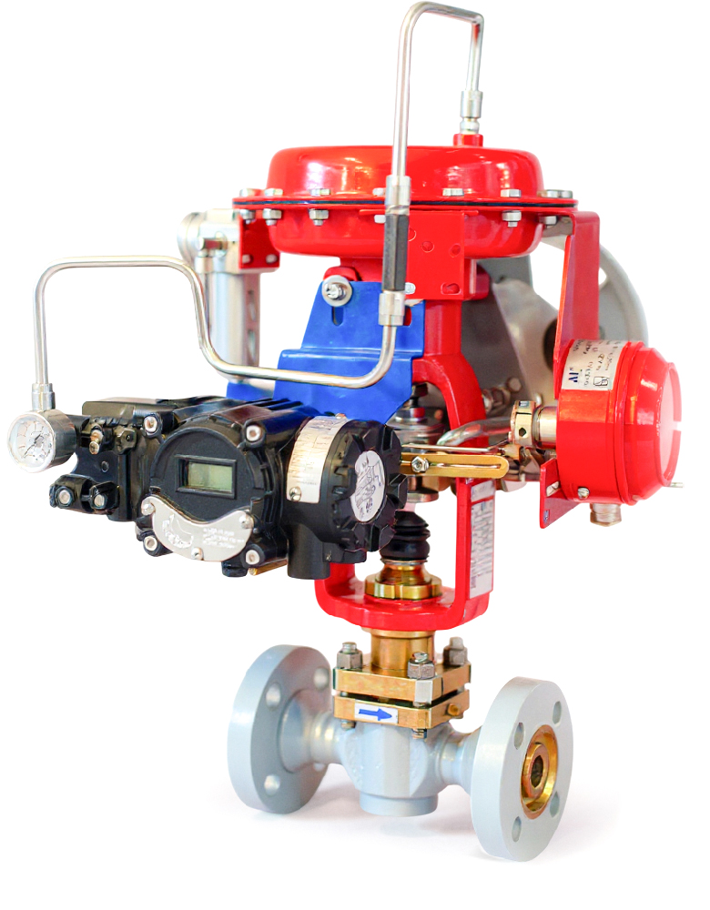 Клапан регулирующе-отсечной с функцией сохранения положения серии КМРО плунжерного типа в литом корпусе. Укомплектован пневматическим приводом, электромагнитным клапаном КСВ, сигнализатором конечных положений СКП, фильтром-регулятором, боковым ручным дублером.