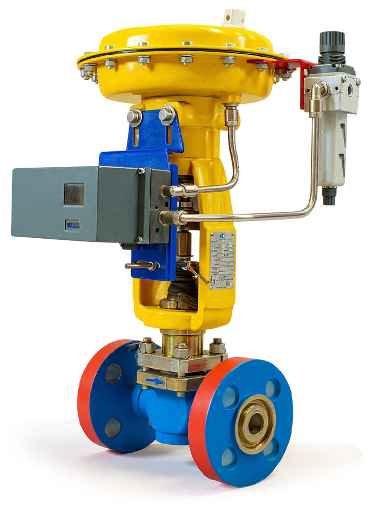 Клапан регулирующий по СТО "Газпром". Клапан серии КМР плунжерного типа в кованом корпусе из нержавеющей стали с пневматическим приводом.