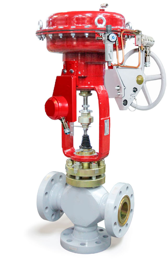 Клапан отсечной серии КМО (КТП) переключающий с пневмоприводом МИМ, трехходовой, для управления двумя потоками сред.