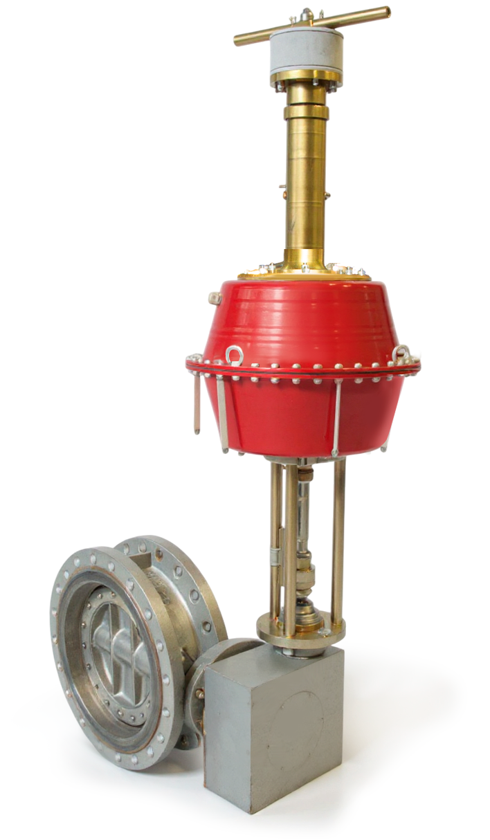 Клапан баттерфляй серии КБО отсечной. Трёхэксцентриковый дисковый затвор, полнопроходный. Укомплектован мембранным приводом МИМ, верхним ручным дублером.
