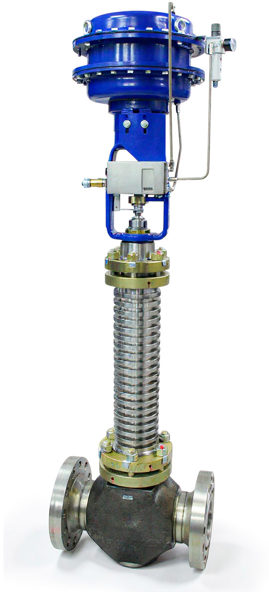 Высокотемпературный регулирующий плунжерный прямоходный клапан серии КМР. Двухкамерный привод двойного действия МИМ обеспечивает максимальное перестановочное усилие и позволяет сохранять заданное положение. Клапан рассчитан на работу при экстремально высоких температурах. Укомплектован пневматическим приводом, позиционером ЛОГИК и фильтром-регулятором.